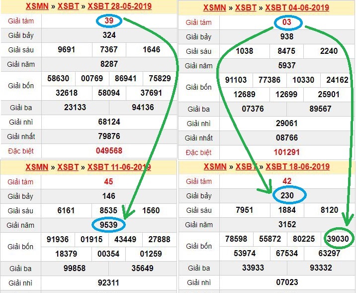 Từ bảng KQXSMN trên bạn có thể thấy giải 8 đài Bến Tre ngày 28/5/2019 rơi cách tuần vào ngày 11/6. Như vậy ta sẽ nuôi cặp xuôi ngược của giải 8 ngày 4/6 cho ngày 18/6, có thể thấy lô 30 về 2 nháy ngày này.