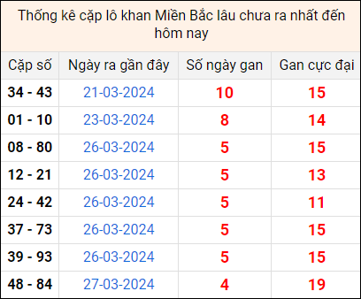 Bảng thống kê cặp lô gan lì lâu về tính tới 1/4