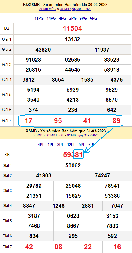 Ví dụ: Ngày 30/3/2023 có kết quả giải 7 miền Bắc về các cầu là 17 – 95 – 41 – 89. Được các con số để ghép dàn đề là: 1, 4, 5, 7, 8, 9. Ngày 31/3/2023 đề về 81