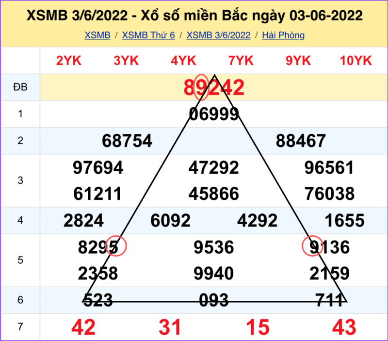 Giải đặc biệt là 89242 và Giải nhất là về 06999