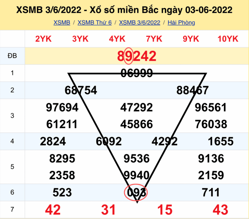 Sau đó bạn đối chiếu thẳng xuống giữa của giải 6 có kết quả là 093. Tiếp tục chọn số khác biệt nhất trong giải đặc biệt và bỏ các số lặp lại nhiều lần.
