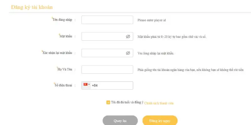 - Họ và tên: Điền họ tên thật của bạn, trùng với tên đăng ký tài khoản ngân hàng khi liên kết với nhà cái.