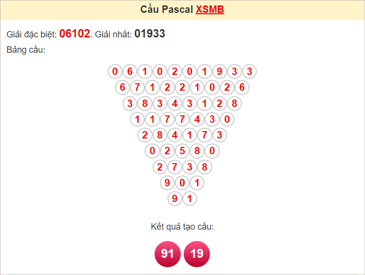 Kết quả từ soi cầu Pascale là cặp số may mắn: 19 91