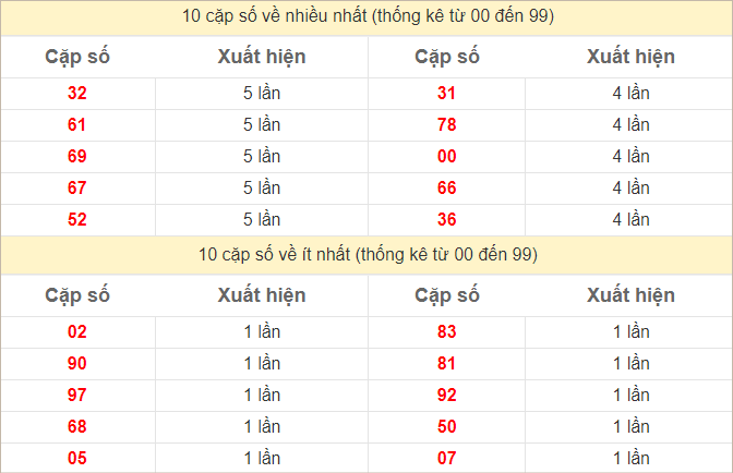 ⭐️ Thống kê tần suất các cặp lô về nhiều trong 10 ngày gần đây: 12 (9 lần), 32, 75 (7 lần), 08, 10, 43, 52, 92 (6 lần)