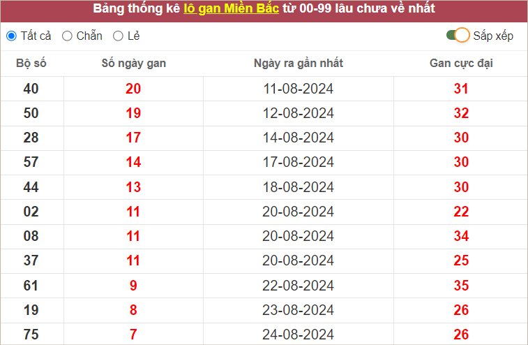 ⭐️ Lô gan XSMB lâu ra nhất: 40 – 50 – 28 – 57 – 44