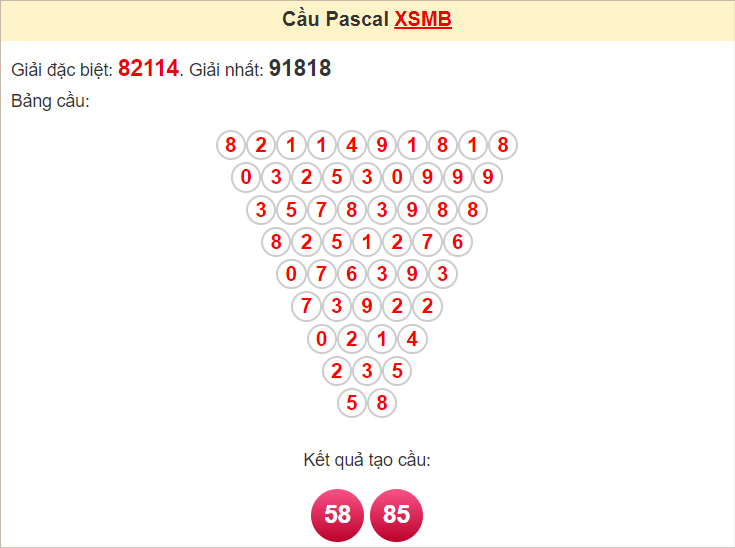 Kết quả từ soi cầu Pascale là cặp số may mắn: 58 85