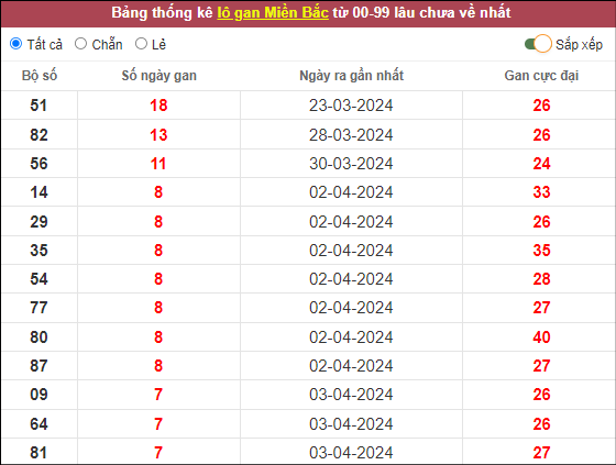 ⭐️ Lô gan MB lâu ra nhất: 51 – 82 – 56 – 14 – 29
