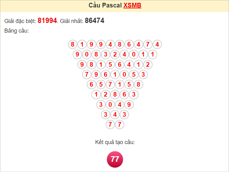 Kết quả từ soi cầu Pascale là cặp số may mắn: 77