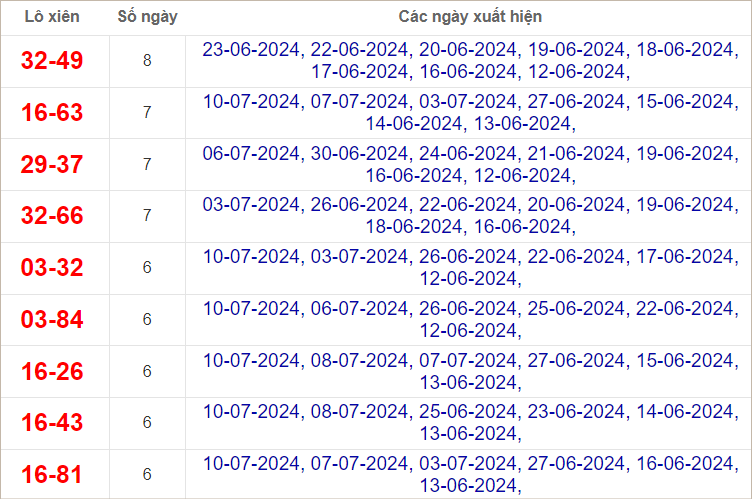 ⭐️ Thống kê tần suất các cặp lô về nhiều trong 10 ngày gần đây: 16, 89 (7 lần), 03, 63, 94 (6 lần), 26, 27, 43 (5 lần)