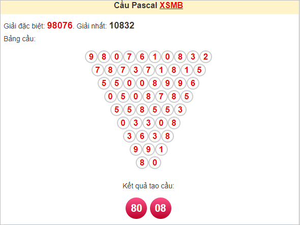 Kết quả từ soi cầu Pascale là cặp số may mắn: 08 80