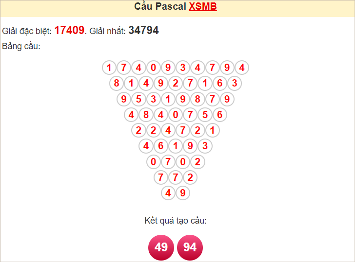 ⭐️ Kết quả từ soi cầu Pascal là cặp song thủ lô khung 3 ngày: 49 – 94