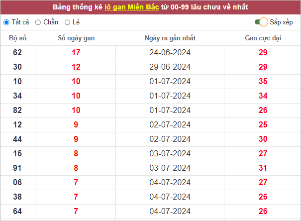 ⭐️Thống kê lô gan miền Bắc lâu ra nhất: 62 – 30 – 10 – 34 – 82