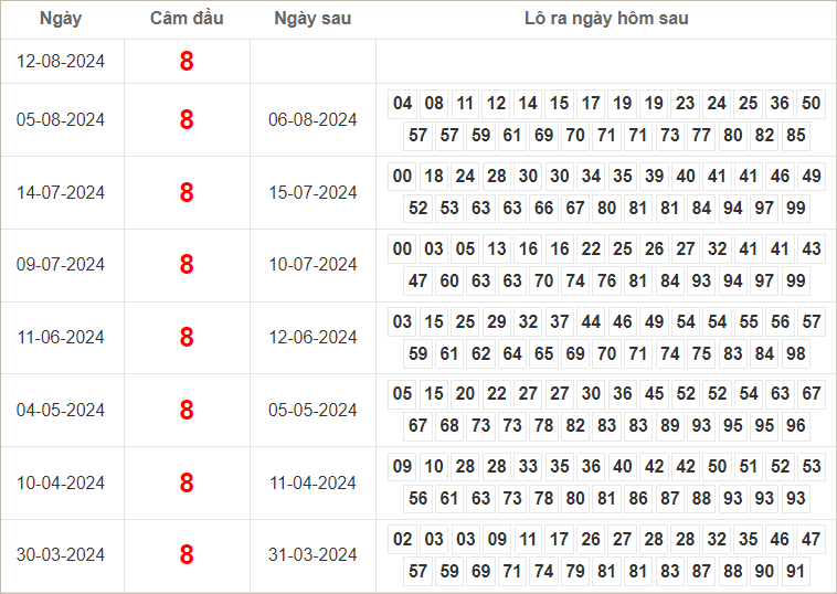 THỐNG KÊ LÔ TÔ KẾT QUẢ XSMB NGÀY 12-8-2024