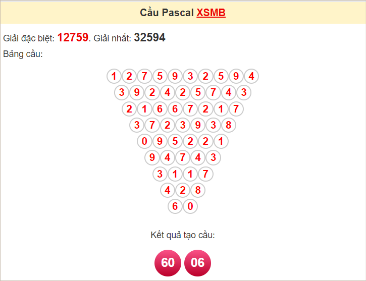 Kết quả từ soi cầu Pascale là cặp số may mắn: 60 06
