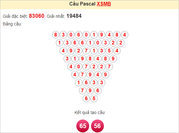 Kết quả từ soi cầu Pascale là cặp số may mắn: 65 56