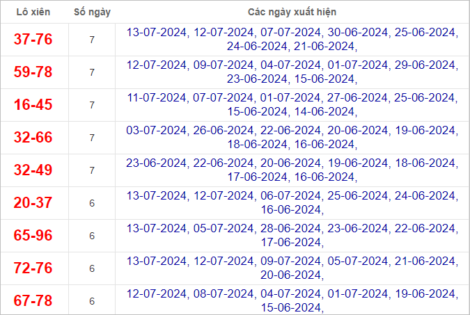 ⭐️ Thống kê tần suất các cặp lô về nhiều trong 10 ngày gần đây: 59, 76 (7 lần), 72 (6 lần), 16, 20, 26, 52, 73 (5 lần)