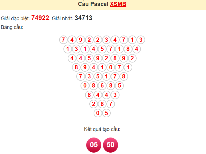 Kết quả từ soi cầu Pascale là cặp số may mắn: 05 50