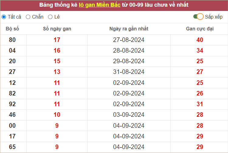 ⭐️Thống kê lô gan miền Bắc lâu ra nhất: 80 – 04 – 20 – 27 – 12