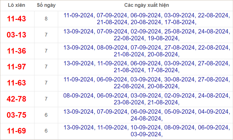 ⭐️ Thống kê tần suất các cặp lô về nhiều trong 10 ngày gần đây: 11 (8 lần), 36, 69, 87, 97 (7 lần), 03, 22, 54 (6 lần)