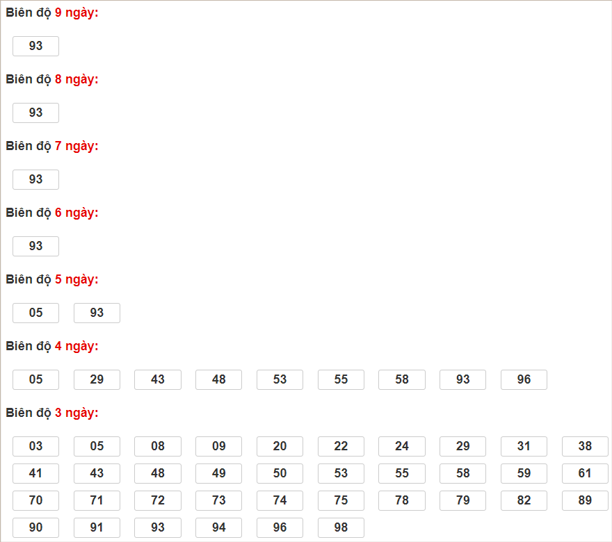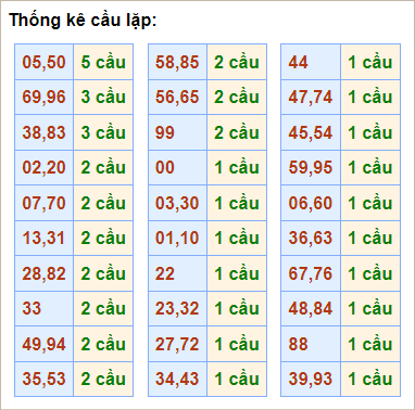 Cặp lô 01, 03, 13, 20, 21, 22, 23, 26, 27, 29, 30, 40, 41, 42, 43, 44, 46, 47, 49, 55, 70, 71, 72, 73, 76, 77, 79, 83, 86, 87, 88, 89, 90, 93, 94, 96, 98, 99 có độ dài 2 ngày