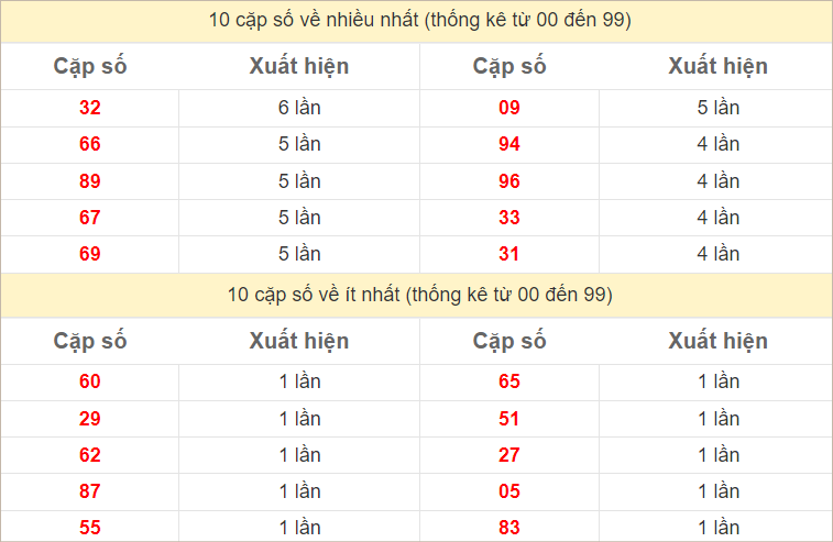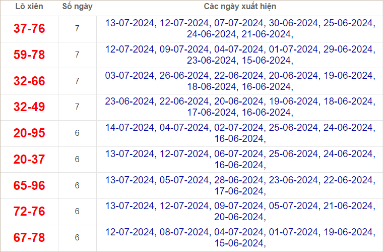 ⭐️ Thống kê tần suất các cặp lô về nhiều trong 10 ngày gần đây: 59, 76 (7 lần), 72, 99 (6 lần), 16, 20, 33, 52 (5 lần)