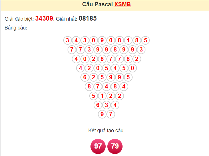 Kết quả từ soi cầu Pascale là cặp số may mắn: 97 79