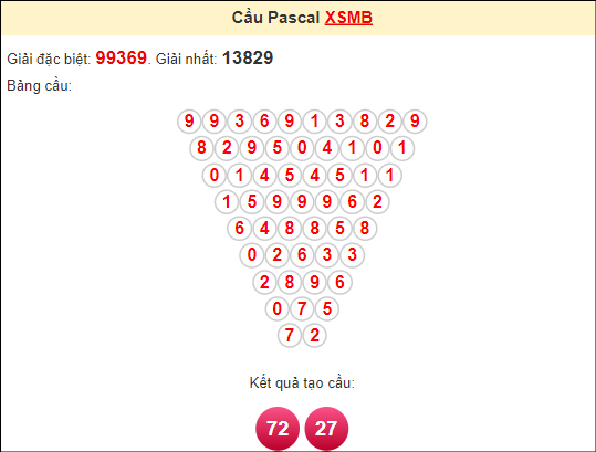Kết quả từ soi cầu Pascale là cặp số may mắn: 27 72