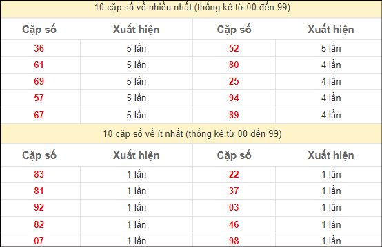 ⭐️ Thống kê tần suất các cặp lô về nhiều trong 10 ngày gần đây: 30, 52, 62, 98 (6 lần), 10, 25, 26, 40 (5 lần)