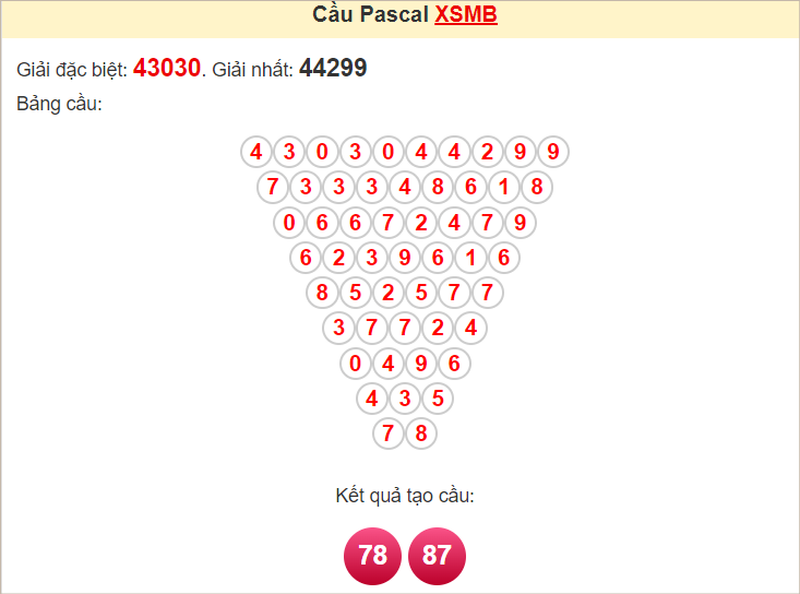 Kết quả từ soi cầu Pascale là cặp số may mắn: 78 87