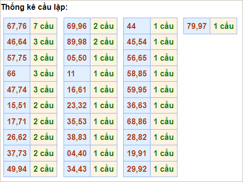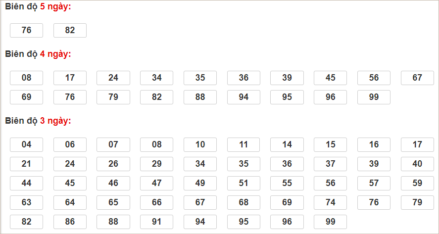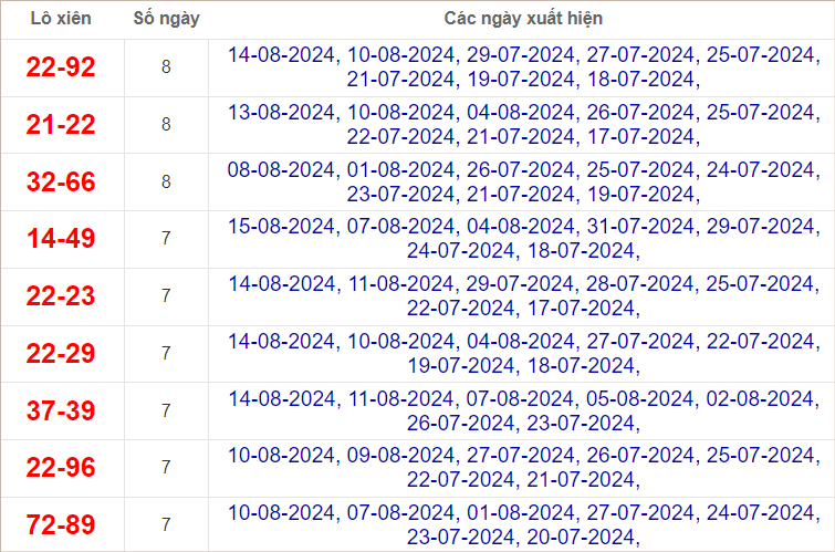 Cặp lô 14, 45, 68, 82, 84 có độ dài 3 ngày.