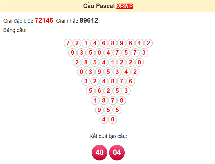 Kết quả từ soi cầu Pascale là cặp số may mắn: 40 04