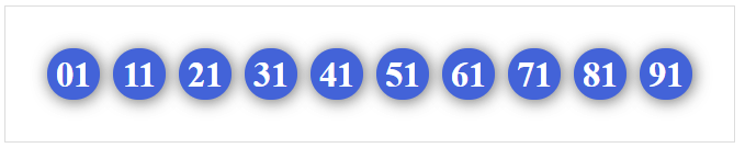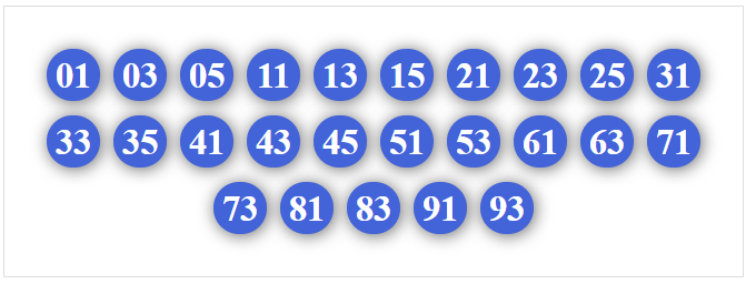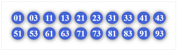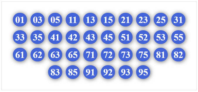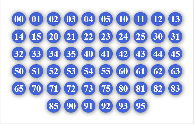 00, 01, 02, 03, 04, 05, 06, 07, 08, 09, 30, 31, 32, 33, 34, 35, 36, 37, 38, 39