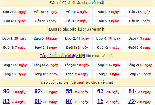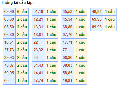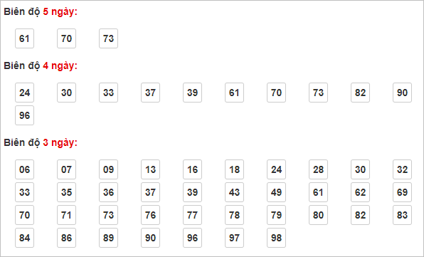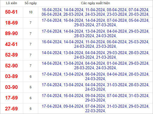 Cặp lô 03, 13, 19, 26, 29, 32, 33, 34, 41, 43, 52, 53, 61, 63, 72, 73, 83, 89, 90, 92, 93, 94, 96, 97 có độ dài 2 ngày.