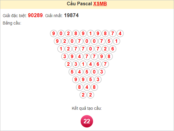 Kết quả từ soi cầu Pascale là cặp số may mắn: 22