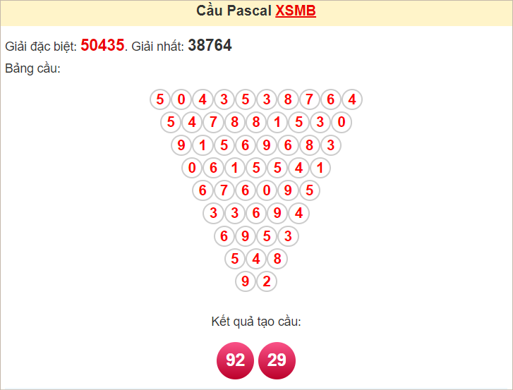 Kết quả từ soi cầu Pascale là cặp số may mắn: 92 29