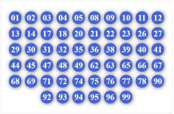 01, 02, 03, 04, 05, 06, 07, 08, 09, 10, 12, 13, 14, 15, 16, 17, 18, 19, 40, 41, 42, 43, 45, 46, 47, 48, 49, 60, 61, 62, 63, 64, 65, 67, 68, 69