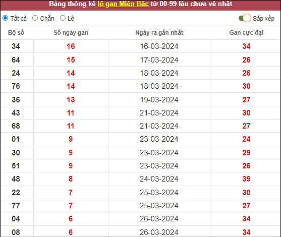 ⭐️Thống kê lô gan miền Bắc lâu ra nhất: 34 – 64 – 24 – 76 – 36