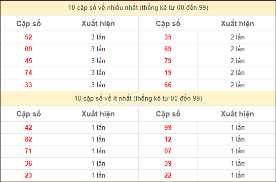 ⭐️ Thống kê tần suất các cặp lô về nhiều trong 10 ngày gần đây: 79 (8 lần), 42 (7 lần), 09, 59 (6 lần), 11, 28, 32, 41 (5 lần)