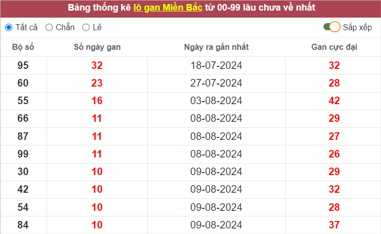 ⭐️Thống kê lô gan miền Bắc lâu ra nhất: 95 – 60 – 55 – 66 – 87