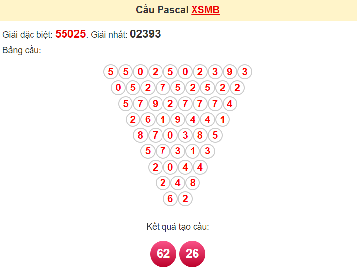 Kết quả từ soi cầu Pascale là cặp số may mắn: 62 26