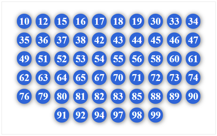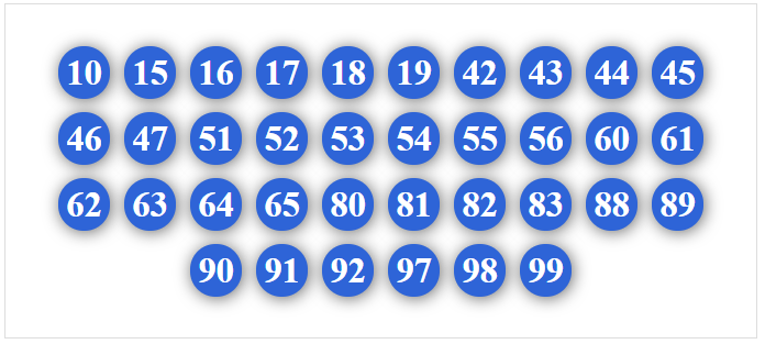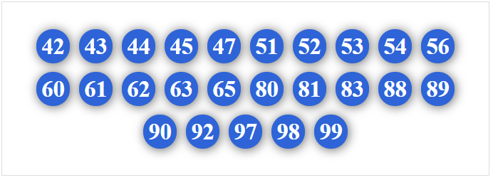 20, 21, 23, 24, 25, 26, 27, 28, 29, 50, 51, 52, 53, 54, 56, 57, 58, 59, 80, 81, 82, 83, 84, 85, 86, 87, 89, 90, 91, 92, 93, 94, 95, 96, 97, 98
