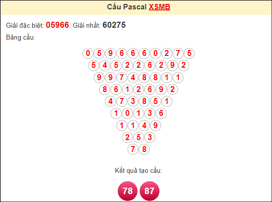 Kết quả từ soi cầu Pascale là cặp số may mắn: 87 78