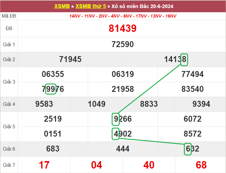 Xem lại bảng KQXSMB ngày 20-6-2024 hôm qua