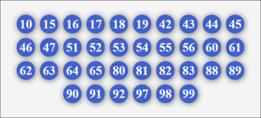 40, 41, 42, 43, 45, 46, 47, 48, 49, 70, 71, 72, 73, 74, 75, 76, 78, 79, 80, 81, 82, 83, 84, 85, 86, 87, 89, 90, 91, 92, 93, 94, 95, 96, 97, 98