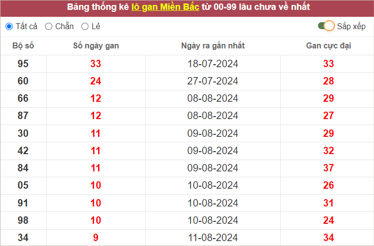 ⭐️ Lô gan MB lâu ra nhất: 95 – 60 – 66 – 87 – 30