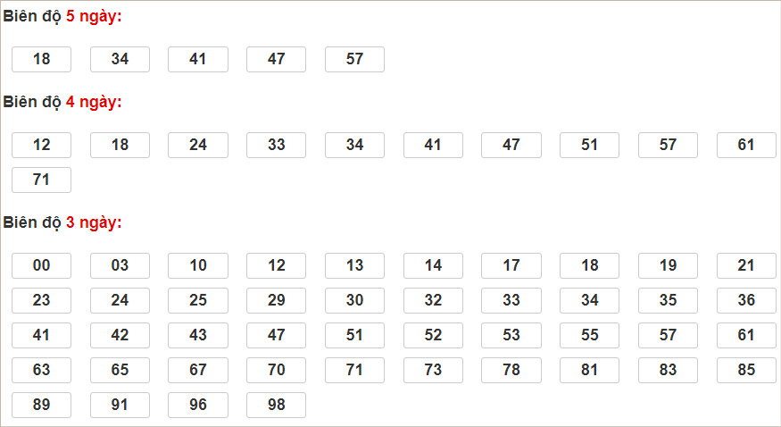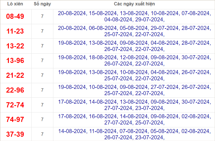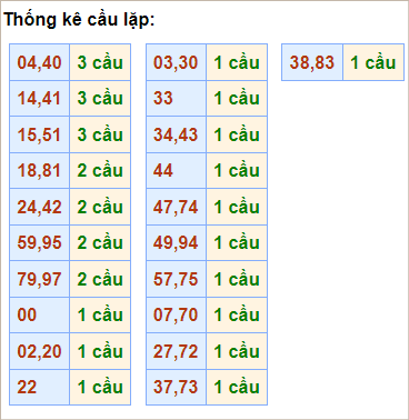 Cặp lô 10, 11, 12, 15, 19, 34, 46, 47, 53 có độ dài 3 ngày.