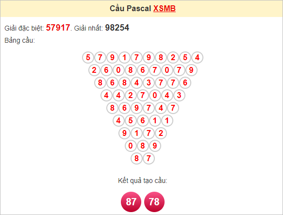Kết quả từ soi cầu Pascale là cặp số may mắn: 87 78