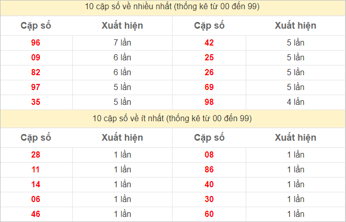 ⭐️ Thống kê tần suất các cặp lô về nhiều trong 10 ngày gần đây: 69, 86 (7 lần), 35, 44, 53, 54, 87, 98 (6 lần)