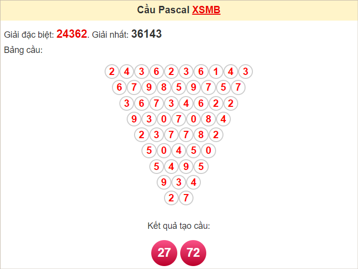 Kết quả từ soi cầu Pascale là cặp số may mắn: 27 72