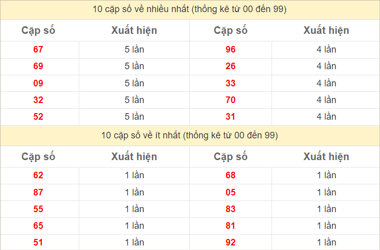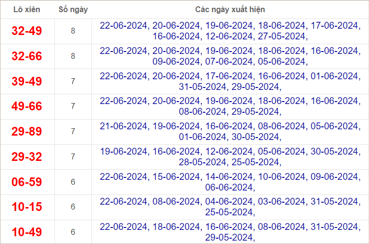 ⭐️ Thống kê tần suất các cặp lô về nhiều trong 10 ngày gần đây: 96 (7 lần), 02, 32, 49, 59, 66, 89 (6 lần)
